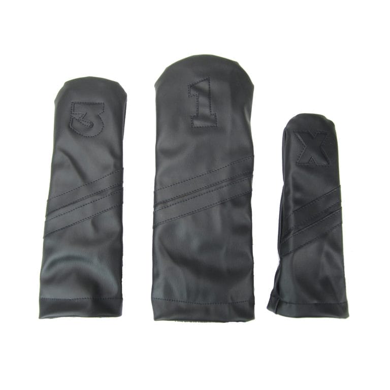Black on Black Murdered Out Golf Headcovers made of Dura-Leather. Available in Set of three or individually in driver, fairway and hybrid sizes. Made of 100% hand-stitched Dura-Leather that will not fade in the sun or stretch out of shape. Flannel lining to keep your club from nicks and scratches and elastic waistband for a secure fit. Driver headcover fit clubs up to 460cc.