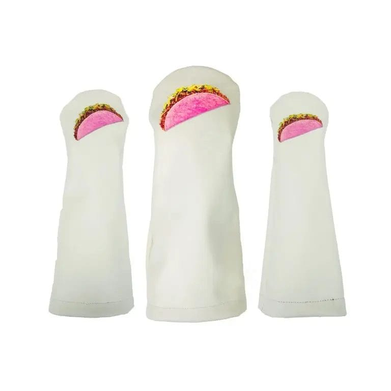 Pink Taco Golf Headcovers are hand made from high quality Dura-Leather. Elastic waistband and fleece lining keep your clubs safe and secure. Available in set of three or individual driver, fairway and hybrid sizes.