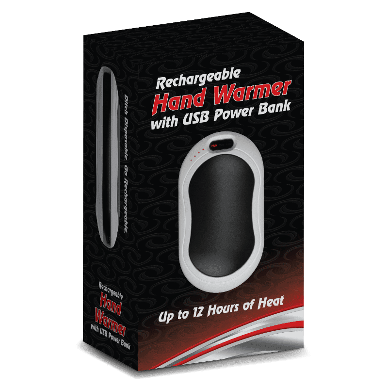 The Rechargeable Hand Warmer is the last hand warmer you will ever need. This high capacity electric hand warmer will not only provide warmth, but also charges your portable electronic devices. The round edges and smooth shape make it comfortable to hold in your hands. Choose between 3 different heat settings. Turn the hand warmer on and place in your pocket for heat on the go. The Rechargeable Hand Warmer is also great for heat therapy by allowing you to target specific achy muscles and provides instant relief. Use the built-in vibration massage mode to help loosen tight muscles. The included micro USB cable allows you to charge the hand warmer virtually anywhere. With the built-in flashlight and ability to charge your mobile phone, this is a must-have addition to your emergency kit and great for camping. Ditch Disposable. Go Rechargeable.